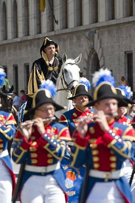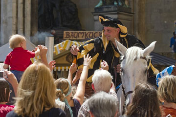 Anlässlich des Münchner Stadtgeburtstages ist der Brezenreiter® auf dem Handwerkerdorf am Odeonsplatz das erste Mal nach genau 206 Jahren offiziell wieder aufgetreten. Seine Brezenspende an die Münchner hat er in der ganzen Altstadt und der Residenz verteilt.