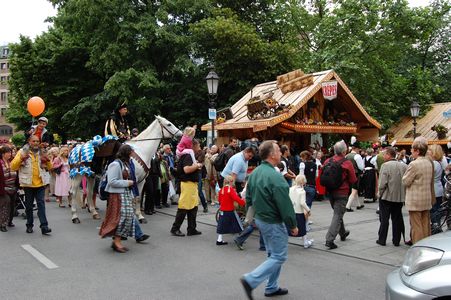 Rund 9.000 Trachtler zogen in historischem Gewand zur Theresienwiese. Auf einem der 40 Festwagen fuhren Ministerpräsident Günther Beckstein (CSU) und Münchens OB Christian Ude (SPD) zur Theresienwiese. Der Umzug gilt als einer der Höhepunkte des Volksfestes. (Quelle:Bayerischer Rundfunk)