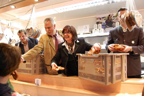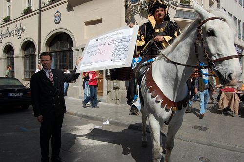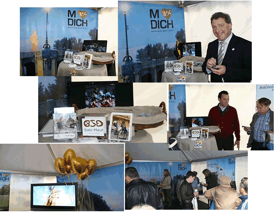 Das Brezenreiter® Team als Gast im Zelt des Referates für Arbeit und Wirtschaft, Projekt 850. Stadtgeburtstag am 13..Oktober 2007 am Münchner Marienplatz. Unser Projekt wurde im Rahmen des Themas "Da sein für München" wiederum vorgestellt. Ab 2008 wird der Brezenreiter® nicht nur wieder reiten und seine beliebte Brezengabe verteilen, sondern seinen Auftrag in der Unterstützung sozial verantwortlichen Handelns in München erfüllen. Dazu gehören die Föderung von einzelnen allgemeinnützigen Projekten, Stiftungshilfe, u.v.m.. Wir halten Sie auf dem laufenden! Übrigens: Wissen Sie, was eine Salz Maut ist?