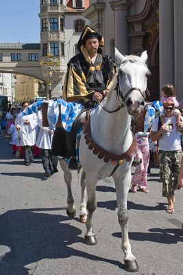 Am Tag der Heiligen Messe zum Geburtstag des Viktualienmarkts führte der Brezenreiter® die Prozession von der Heilig Geist Kirche zum Maibaum auf dem Viktualienmarkt an, wo Pfarrer Dr. Amman den Markt segnete und auf die Bedeutung von sozialer Verantwortung und Miteinander verwiesen hat.